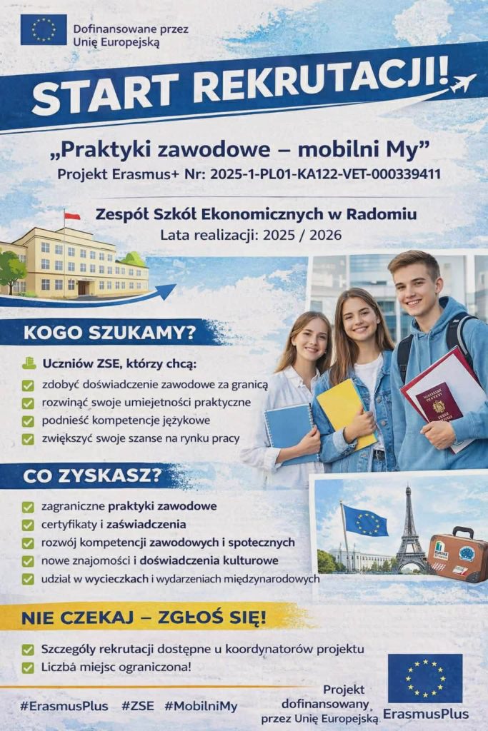 Projekt krótkoterminowy o numerze projektu: 2025-1-PL01-KA122-VET-000339411 w ramach AKCJI 1 Mobilność uczniów i kadry w ramach sektora Kształcenie i Szkolenia Zawodowe w programie Erasmus+ projekty krótkoterminowe (KA122-VET) realizowany w ZESPOLE SZKÓŁ EKONOMICZNYCH w Radomiu.