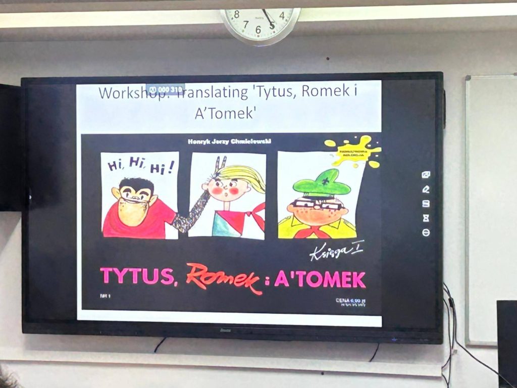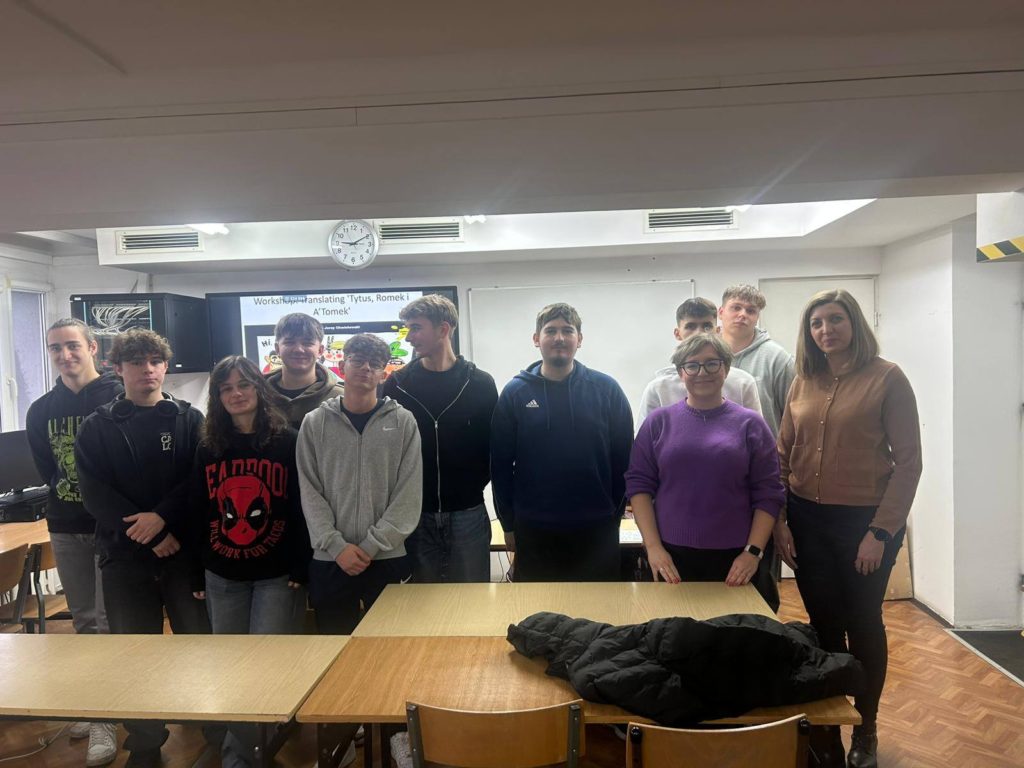 Uczniowie mieli okazję sprawdzić swoje umiejętności, tłumacząc fragmenty kultowego komiksu „Tytus, Romek i Atomek”. W trakcie pracy zwracali uwagę na odwołania kulturowe, styl tłumaczenia oraz jedno z największych wyzwań translatorskich – tłumaczenie nazw własnych.