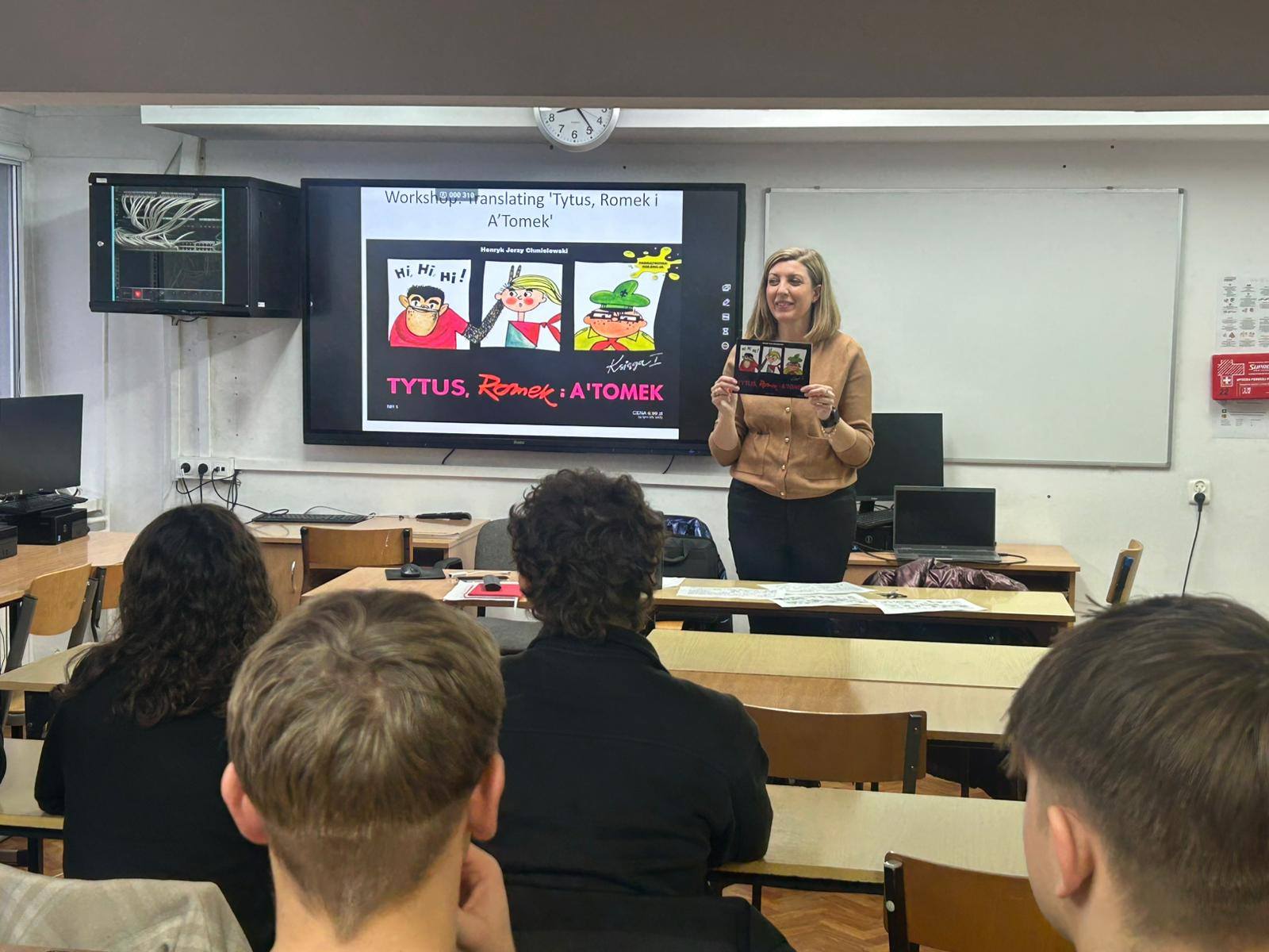 Uczniowie mieli okazję sprawdzić swoje umiejętności, tłumacząc fragmenty kultowego komiksu „Tytus, Romek i Atomek”. W trakcie pracy zwracali uwagę na odwołania kulturowe, styl tłumaczenia oraz jedno z największych wyzwań translatorskich – tłumaczenie nazw własnych.